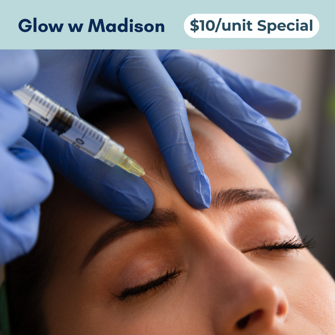 Step into a refreshed, natural glow with our Glow With Madison special. For a limited time, enjoy $10/unit neurotoxin pricing (minimum 40 units) with our Nurse Practitioner, Madison.