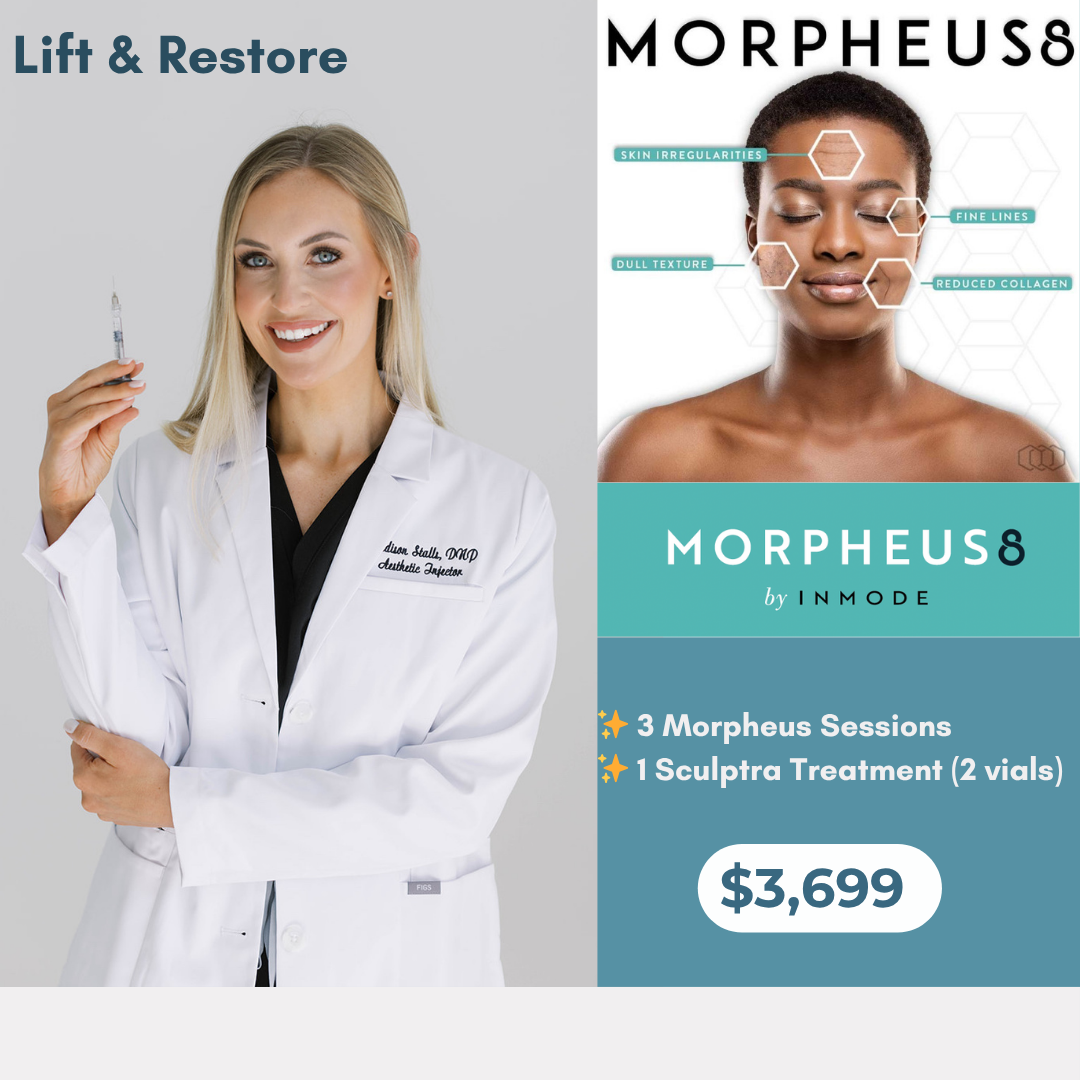 Rediscover lifted, refreshed, naturally radiant skin. This transformative series combines the collagen-rebuilding power of three Morpheus8 Face & Neck treatments with the regenerative benefits of one Sculptra treatment (2 vials included).
